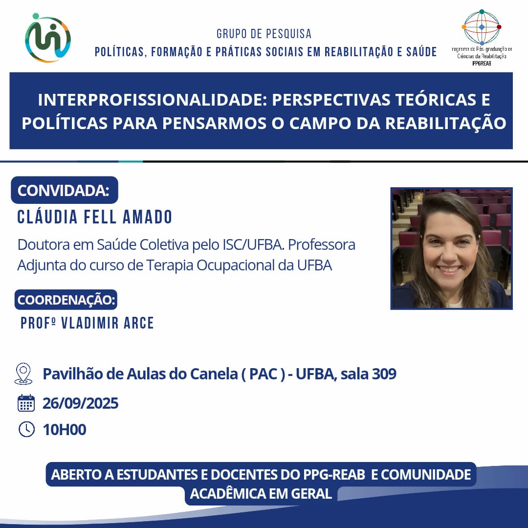 Convidamos todas e todos a participarem do Projeto de Extensão Reabilitação e Saúde em Debate, promovido por docentes da Linha de Pesquisa Políticas, Formação e Práticas Sociais em Reabilitação, do Programa de Pós-graduação em Ciências da Reabilitação. No dia 26/09/2025, receberemos a profa. Dra. Cláudia Fell Amado, do curso de Terapia Ocupacional da Faculdade de Medicina da UFBA, que debaterá "Interprofissionalidade: perspectivas teóricas e políticas para pensarmos o campo da reabilitação". A atividade será coordenada pelo professor Dr. Vladimir Arce (DEPFONO e PPG-REAB).